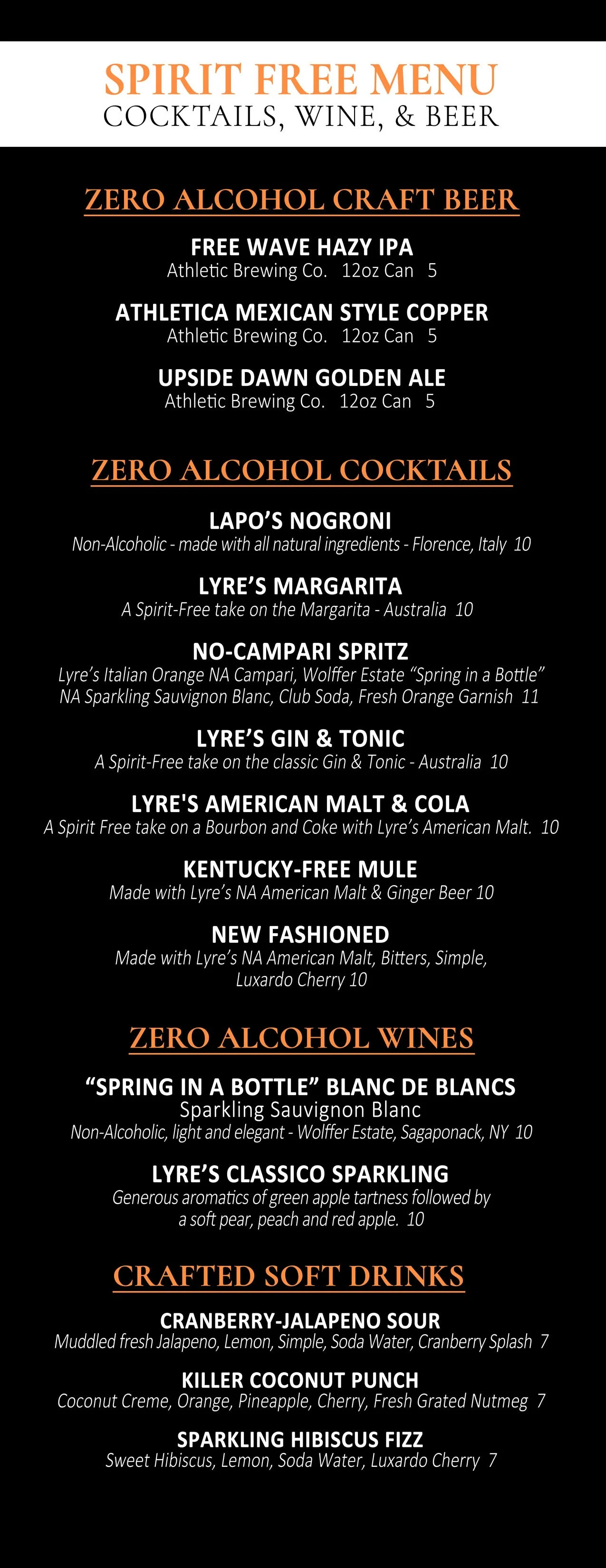 We’re proud to offer an extensive Spirit Free drink menu. Don’t hesitate to speak to our bartenders for more cocktail ideas.Enjoy,The Front Street Social Club